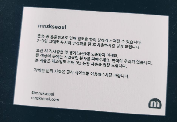 가격은 38,000won 이다. 배송비도 별도. 큰 규모로 생산되는 제품이 아니기에 mnskseoul 공홈과 OCO 라는 브랜드 셀렉샵을 통해 구매할 수 있는데, 그마도 셀렉샵에는 재고가 없어 공홈을 통해서만 구매가 가능했다. 내가 사려는 LAUNDROMAT 제품은 3~4일이 걸린다고 명시가 되어있을 뿐더러 리뷰에서도 가장 불티가 나는 제품인 듯 했다. 가수 미노이를 비롯한 몇몇 셀럽들의 소개가 마케팅인지 자발적인 입소문인지는 몰라도 매출에 좋은 효과를 일으키고 있는 것은 분명했다. 그래도 몇주안에는 오지않겠나 하는 느긋한 마음으로 물건을 기다렸고 생각보다 늦지 않게 일주일 안에 물건을 수령할 수 있었다.