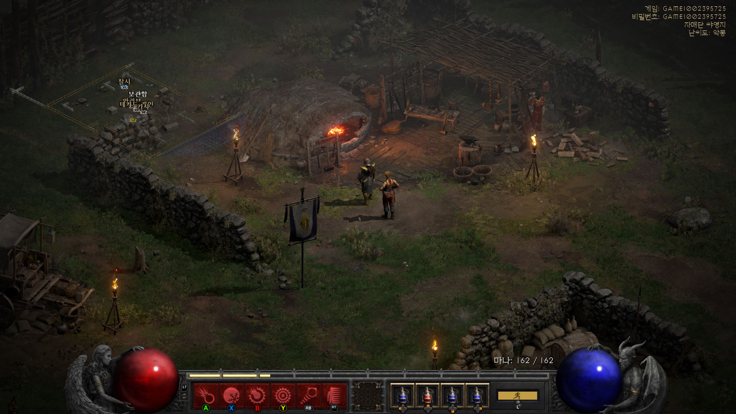 곧이어 디아블로2 레저렉션을 XBOX 4세대 컨트롤러로 플레이 해보았다. 디아블로2 레저렉션은 콘솔 버전을 모두 출시하였기도하고 PC 버전의 컨트롤러 플레이를 매우 원활히 지원한다. 별다른 설정없이도 컨트롤러가 연결되어있으면, 위 캡쳐와 같이 컨트롤러 플레이 모드로 전환된다. 지도표시, 달리기 전환, 무기 전환 등 구현이 쉽지 않을 것 같은 것들도 패드로 모두 지원하였고 컨트롤러 플레이의 장점은 총 12개의 기술을 바로 쓸 수 있다는 것이다. 캐릭터 대비 몹들이 아주 센 긴박한 상황이 아니라면 충분히 게임패드 플레이가 확실히 손이 덜 아플 것 같았다. 아직 게임패드 플레이가 익숙치 않아 요즘말로 뚝딱거리게 되고, 불필요하게 물약을 많이 먹거나 키보드+마우스 플레이에서는 그렇지 않을 상황에서도 몬스터에 의해 쉽게 죽을뻔 하기도 했다. 게임패드 플레이에서는 스킬 사용시 자동으로 몹들을 조준해 주는 차이가 있다. 소서리스(원소술사)의 텔레포트(순간이동) 기술 사용시는 화면 끝까지가 아닌 화면 중간정도의 거리로 이동된다. 스킬 사용시엔 모두 진동이 들어온다.