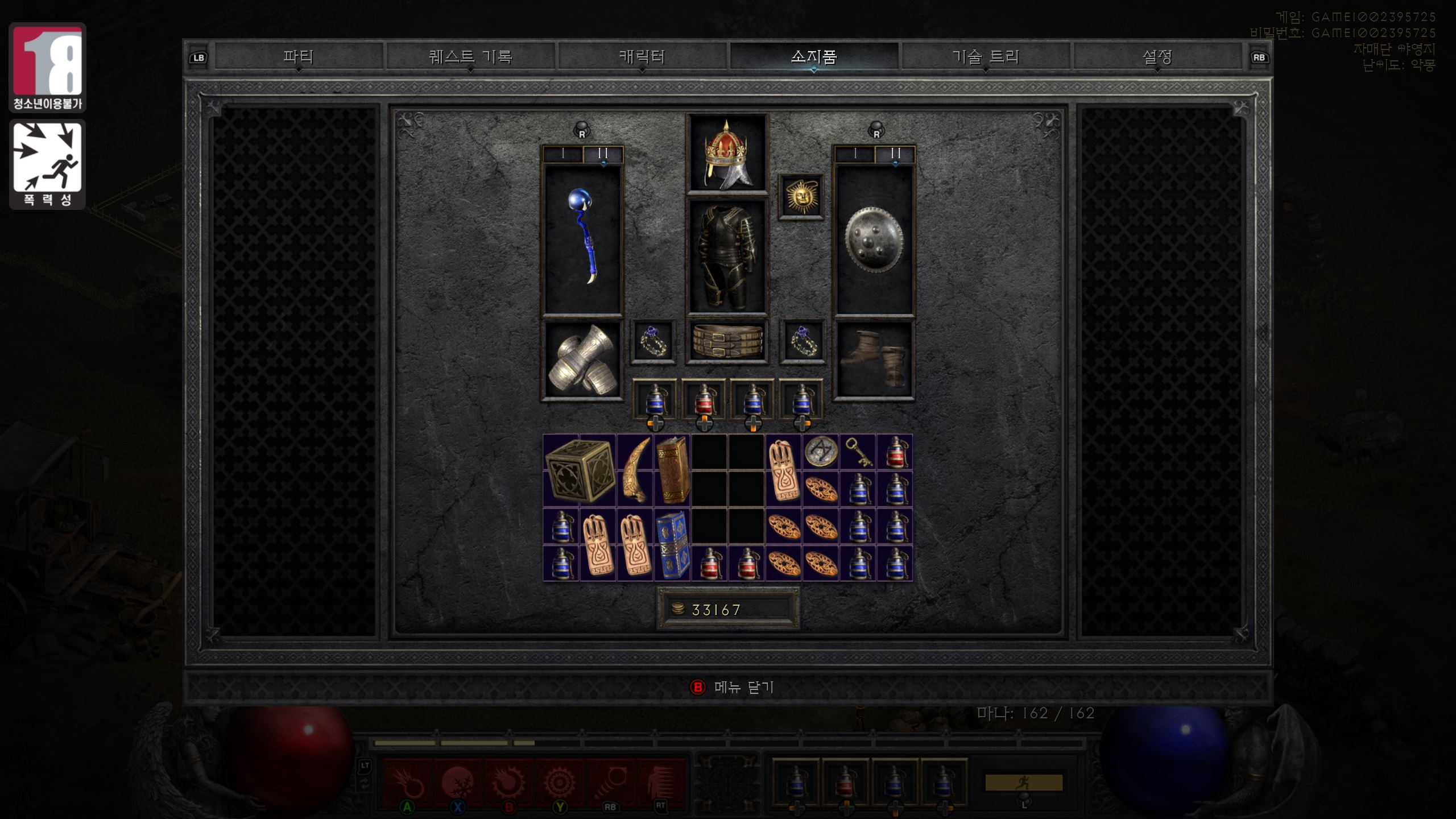 스킬트리, 스탯 적용 등을 모두 게임 패드 플레이를 통해서도 할 수 있도록 구현하였고, 마찬가지로 인벤토리 활용도 가능하고 특이하게도 인벤토리 자동정리 기능도 있다. 다만 보관함, 호라드르 함 등의 이용은 다소 불편해서 마우스를 잡게된다. 게임 패드 플레이와 키보드+마우스 플레이의 전환이 아주 즉각적이기 때문에 큰 불편함은 없지만, 아무래도 패드로 모든 것이 원활한 것이 아니기때문에 다소 아쉽다.